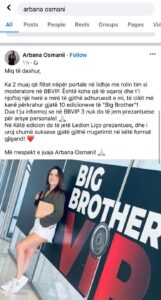 Nëpër rrjetet sociale po qarkullon një postim i moderatores Arbana Osmani tek konfirmon se këtë vit prezantimi i “Big Brother VIP” do t’i besohet Ledion Liços.