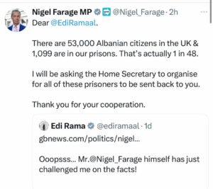 Në një postim të ri në Twitter, ai e etiketon Ramën duke shkruar se në Mbretërinë e Bashkuar jetojnë 53,000 qytetarë shqiptarë, nga të cilët 1,099 ndodhen në burgje.
