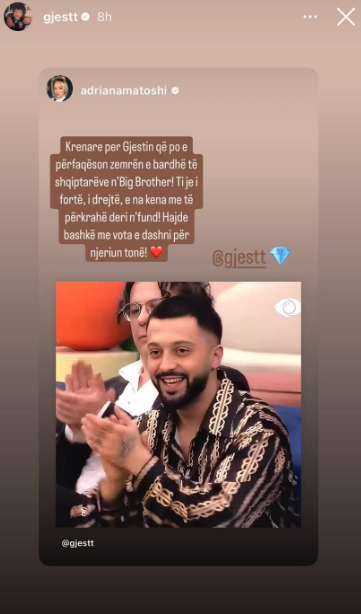 Matoshi përmes një postimi ishte shprehur “Krenare për Gjestin që po e përfaqëson zemrën e bardhe të shqiptareve n’Big Brother! Ti je i fortë, i drejtë, e na kena me të përkrah deri në fund”.