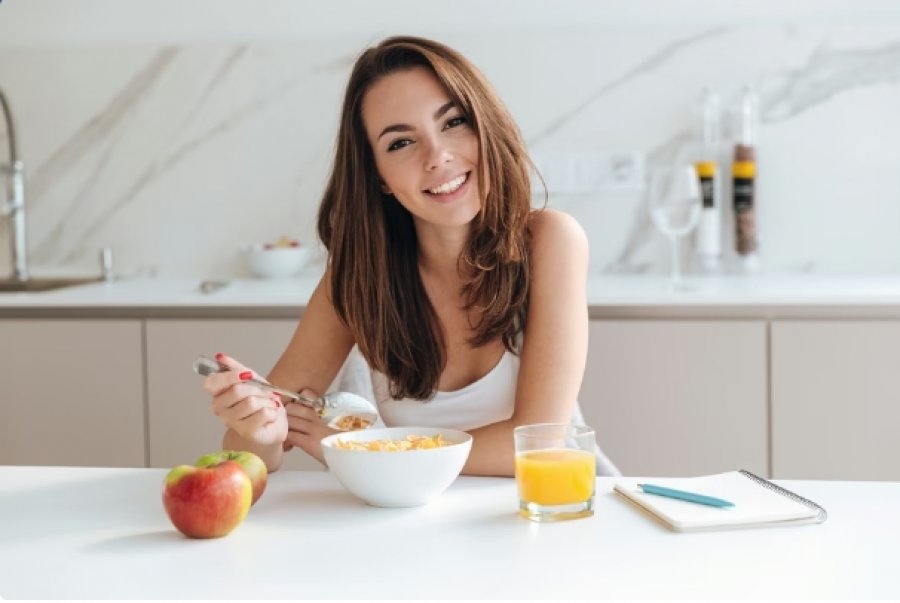 Nëse dëshironi që mëngjesi juaj të jetë një burim i qëndrueshëm energjie, për të rritur metabolizmin tuaj dhe për t’ju mbajtur të ngopur për më gjatë, është më mirë të zgjidhni proteina, yndyrna të shëndetshme dhe fibra – për shembull vezë, bollgur me fara ose kos me arra.