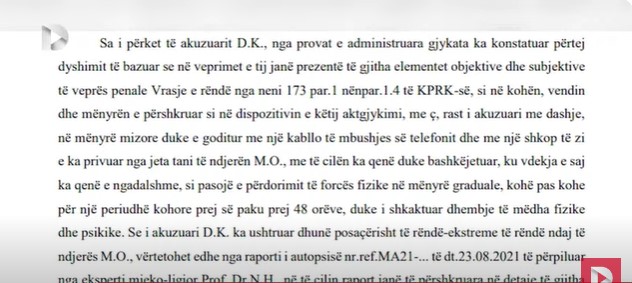 “Sa i përket të akuzuarit D.K., nga provat e administruara gjykata ka konstatuar përtej dyshimit të bazuar se në veprimet e tij janë prezentë të gjitha elementet objektive dhe subjektive të veprës penale Vrasje e rëndë nga neni 173 par.1 nënpar.1.4 të KPRK-së, si në kohën, vendin dhe mënyrën e përshkruar si në dispozitivin e këtij aktgjykimi, me ç, rast i akuzuari me dashje, në mënyrë mizore duke e goditur me një kabllo të mbushjes së telefonit dhe me një shkop të zi e ka privuar nga jeta tani të ndjerën M.O., me të cilën ka qenë duke bashkëjetuar, ku vdekja e saj ka qenë e ngadalshme, si pasojë e përdorimit të forcës fizike në mënyrë graduale, kohë pas kohe për një periudhë kohore prej së paku prej 48 orëve, duke i shkaktuar dhembje të mëdha fizike dhe psikike. Se i akuzuari D.K. ka ushtruar dhunë posaçërisht të rëndë-ekstreme të rëndë ndaj të ndjerës M.O., vërtetohet edhe nga raporti i autopsisë nr.ref.MA21-… të dt.23.08.2021 të përpiluar nga eksperti mjeko-ligjor Prof. Dr.N.H., në të cilin raport janë të përshkruara në detaje të gjitha lëndimet e shkaktuara të shumëfishta trupore dhe shkaku i vdekjes së sajë.”