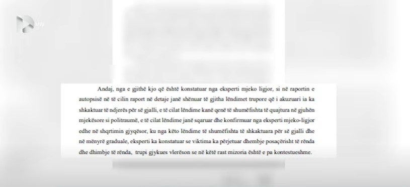 “Andaj, nga e gjithë kjo që është konstatuar nga eksperti mjeko ligjor, si në raportin e autopsisë në të cilin raport në detaje janë shënuar të gjitha lëndimet trupore që i akuzuari ia ka shkaktuar të ndjerës për së gjalli, e të cilat lëndime kanë qenë të shumëfishta të quajtura në gjuhën mjekësore si politraumë, e të cilat lëndime janë sqaruar dhe konfirmuar nga eksperti mjeko-ligjor edhe në shqrtimin gjyqësor, ku nga këto lëndime të shumëfishta të shkaktuara për së gjalli dhe në mënyrë graduale, eksperti ka konstatuar se viktima ka përjetuar dhembje posaçërisht të rënda dhe dhimbje të rënda, trupi gjykues vlerëson se në këtë rast mizoria është e pa kontestueshme.”
