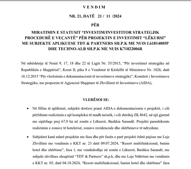 “Në fillim të aplikimit, subjekti dorëzoi pranë AIDA-s dokumentacionin e projektit, i cili përfshinte realizimin e një kompleksi të madh turistik, i cili shtrihej ZK 8642, në një gjurmë me sipërfaqe prej 67,9 ha në zonën e Lëkursit, Bashkia Sarandë. Projekti parashikonte realizimin e zonave të hotelerisë, zonave rezidenciale dhe shërbimeve të ndryshme. Subjektet kanë ndarë projektin me faza dhe për fazën e parë projekti është pajisur me Leje Zhvillimi nga KKT për resort multifunksional, banim hotel dhe shërbime” thuhet në vendimin e Këshillit të Investimeve Strategjike. Ditar.al