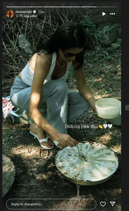 Në foto shihet e ulur pranë saçit, ndërsa përgatit një nga gatimet më të dashura shqiptare. Përshkrimi mbi foto, “Didi tuj pjek flija 🤲🤍🤍”.