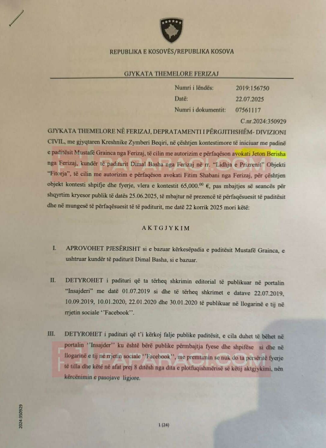 Basha është shpallur fajtor për shpifje në lidhje me akuzat publike ndaj Graincës, një biznesmeni të ndërtimit në Ferizaj dhe ish-zyrtar me funskion publik, veprimtarinë e të cilit e kishte përshkruar si “mafi të betonit”.