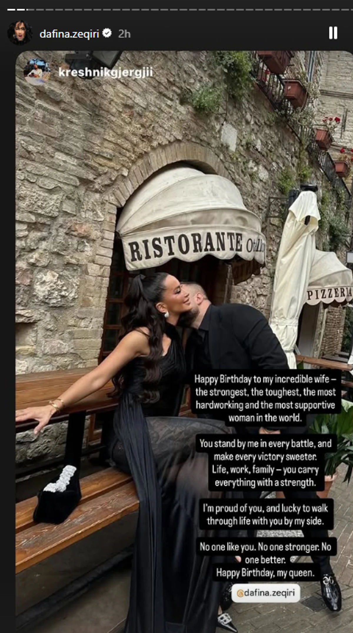 “Gëzuar ditëlindjen gruas sime të jashtëzakonshme – më e forta, më e palodhura, më punëtorja dhe më mbështetësja në botë. Ti qëndron pranë meje në çdo betejë dhe e bën çdo fitore më të bukur”.