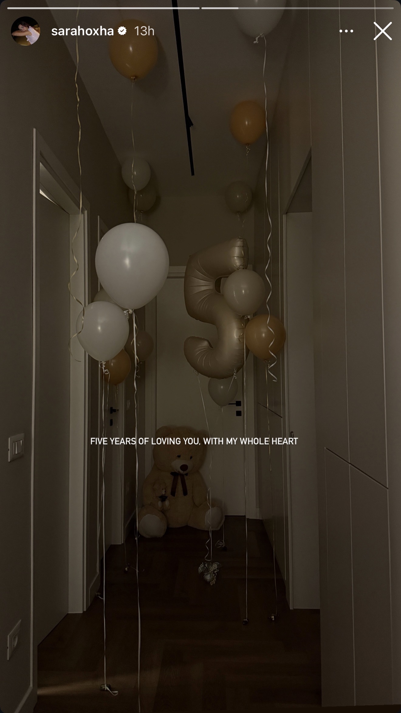 Sara ka shpërndarë një pamje nga festa private, ku shfaqej një korridor i dekoruar me tullumbace të bardha dhe bezhë, si dhe një tullumbace të madhe që formonte numrin “5”.