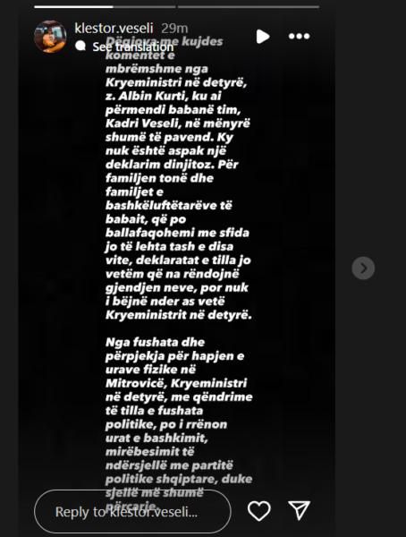 Djali i ish-kryetarit të Kuvendit të Kosovës Kadri Veselit, Klestori Veseli, ka reaguar ndaj deklaratave të fundit të kryeministrit Albin Kurti.