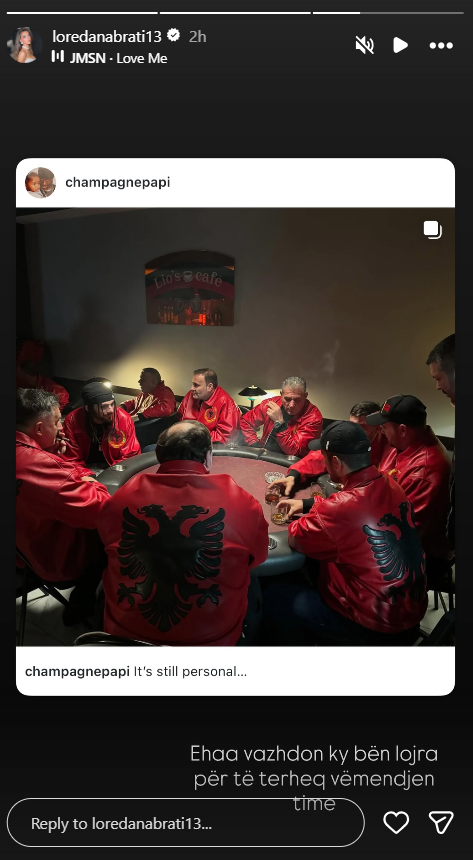 Modelja e njohur Loredana Brati ka reaguar pasi reperi kanadez Drake ka publikuar një fotografi në rrjetet e tij sociale ku shihen, një grup burrash janë ulur rreth një tavoline pokeri, të veshur me xhaketa të kuqe që mbajnë shqiponjën dykrenare.