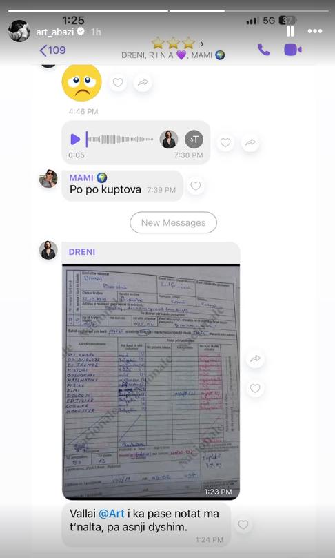 Në bisedë, vëllai i tij Dreni me humor shkroi se Arti kishte pasur nota më të larta se Kryetari i sapozgjedhur i Kuvendit, duke shoqëruar mesazhin edhe me foton e dëftesës së Bashës.
