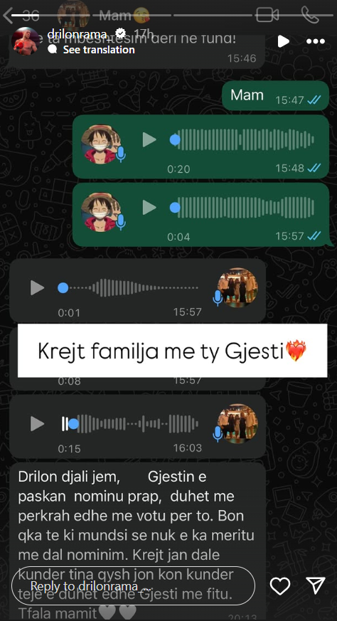 Përmes Instastory, Driloni ka bërë të ditur se familja e tij po e përkrahë Gjestin në BBVA.
