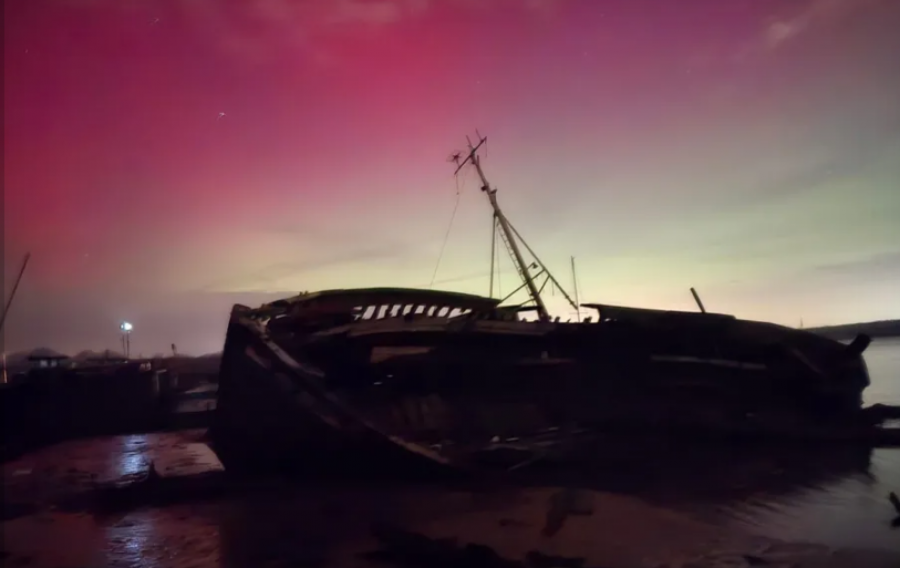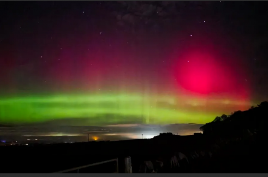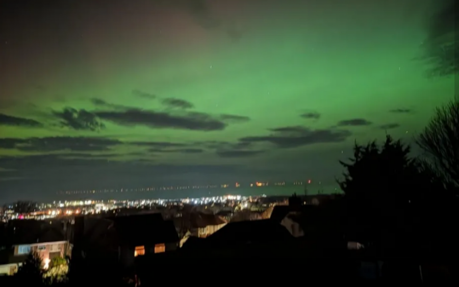 Qielli mbi Mbretërinë e Bashkuar u mbulua me ngjyrat e gjelbër dhe rozë të Dritave Veriore gjatë mbrëmjes së të hënës.