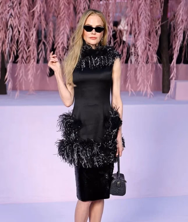 Nicole Kidman, 58 vjeçe, u shfaq e sofistikuar me një fustan midi të zi të zbukuruar me pupla, syze të errëta dhe këpucë klasike bardh e zi.
