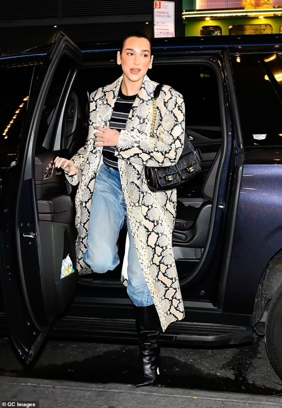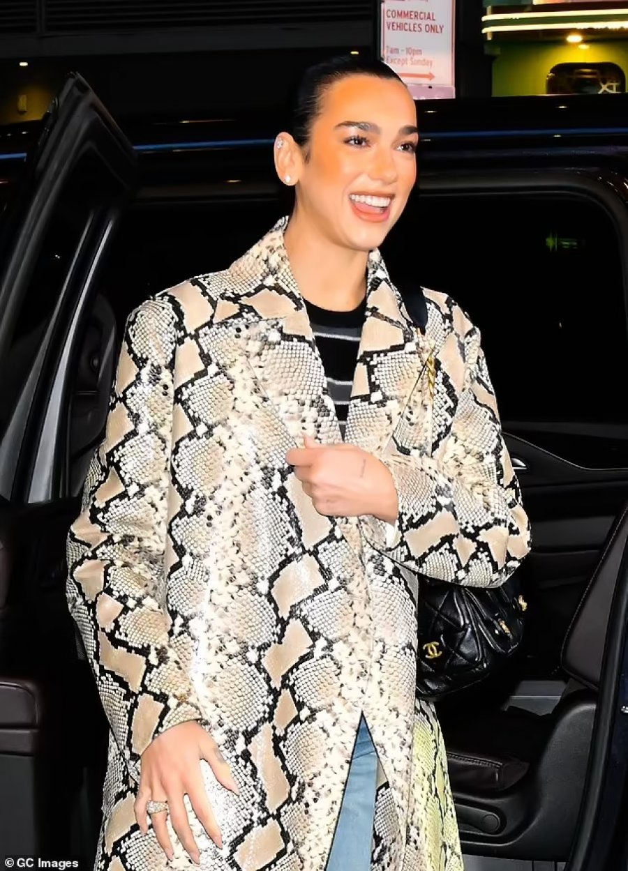 Dua Lipa tërhoqi vëmendjen me një pallto mbresëlënëse me print gjarpëri ndërsa u pa duke dalë nga një taksi pranë studiove të CBS në Neë York City.