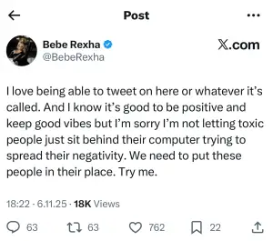 Këngëtarja shtoi se nuk ka ndërmend të injorojë sjelljet toksike online dhe se shpesh vendos të reagojë për t’i vënë kufi komenteve negative. “Nuk kam ndërmend t’i lë njerëzit toksikë të shpërndajnë negativitet. Dikush duhet t’u tregojë vendin”, u shpreh ajo.