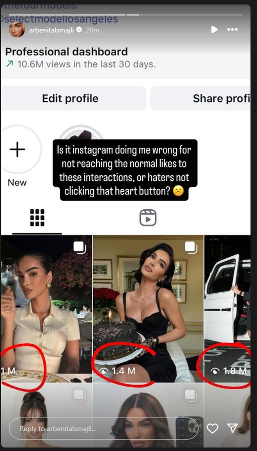 Ajo publikoi një screenshot nga profili i saj, ku shihet se ka mbi 10.6 milionë shikime vetëm në 30 ditët e fundit, megjithatë pëlqimet në postimet e saj nuk po përputhen me këto shifra të larta.