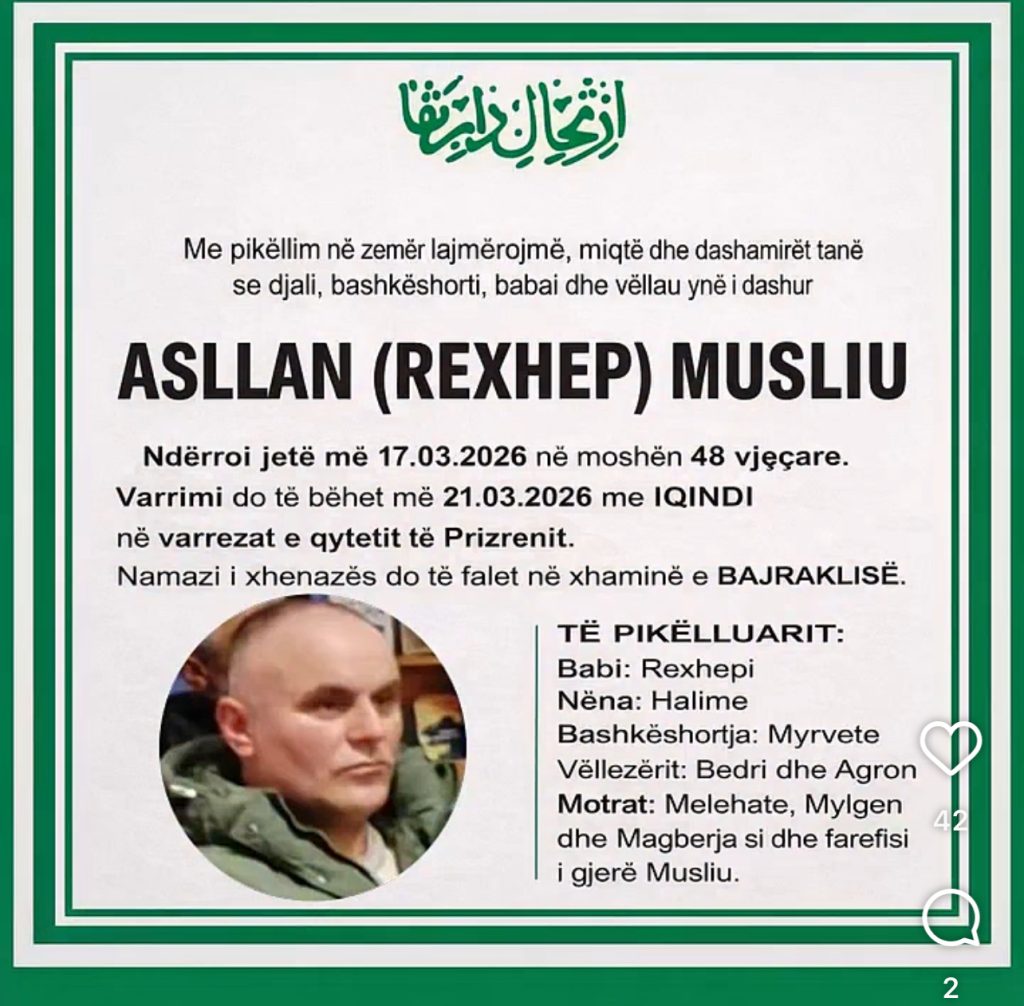 Ndërsa bëhet e ditur se Asllan Musliu do të varroset në varrezat e qytetit të Prizrenit.