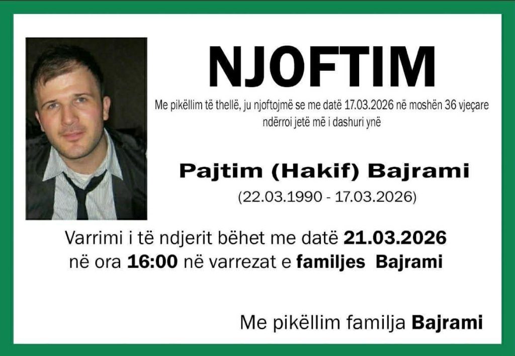 Familjarët kanë njoftuar se Pajtim Bajrami do të varroset në ora 16:00 në varrezat e familjes Bajrami, transmeton Klankosova.tv.