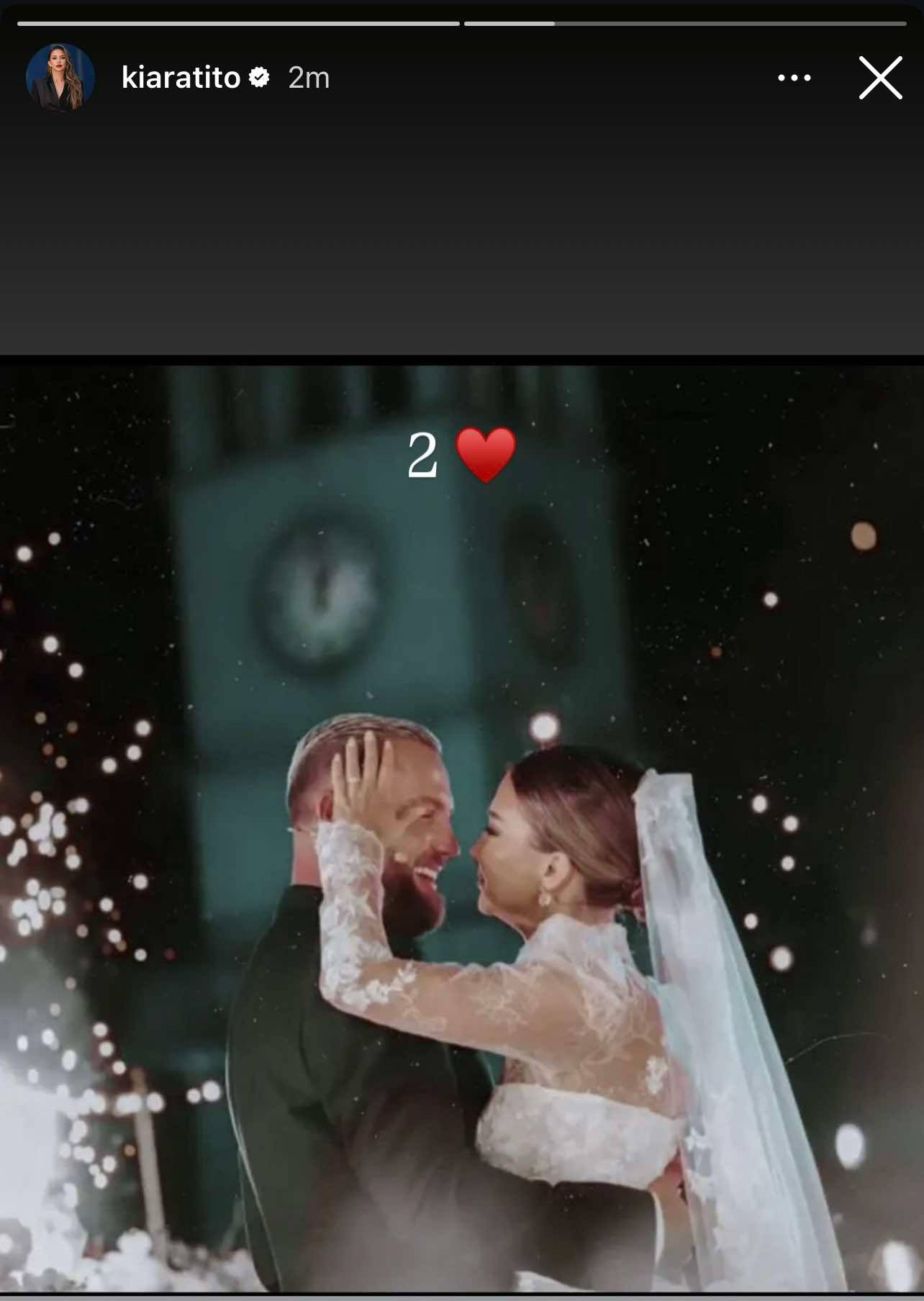 Në një postim në Instagram Story, Kiara publikoi një foto të tyre në momentin romantik të dasmës, shoqëruar me një emoji zemre dhe numrin “2”, si simbol i dy viteve martesë.