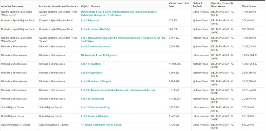 “Delta pharma” bie në sy se kjo shoqëri ka fituar një numër të lartë tenderash të shpallura nga Ministria e Shëndetësisë, nga ato me vlera të larta, e deri tek më të ultat. “Delta Pharma” ka fituar 24 kontrata në total nga Ministria e Shëndetësisë, 6 nga Qëndra Spitalore Universitare “Nënë Tereza”, 1 nga Spitali Universitar i Traumës, 2 nga Spitali Rajonal i Durrësit, 1 nga “Shefqet Ndroqi”, 2 nga Spitali Beratit, 1 Spitali Shkodrës.