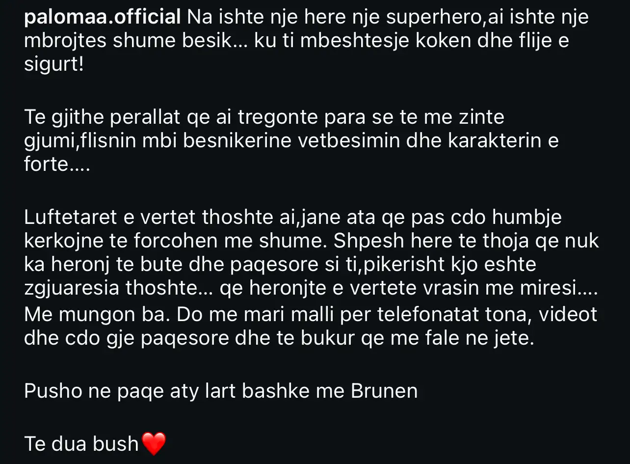 Luftetaret e vertet thoshte ai, jane ata qe pas cdo humbje kerkojne te forcohen me shume. Shpesh here te thoja qe nuk ka heronj te bute dhe paqesore si ti, pikerisht kjo eshte zgjuaresia thoshte… qe heronjte e vertete vrasin me miresi…. Me mungon ba. Do me mari malli per telefonatat tona, videot dhe cdo gje paqesore dhe te bukur qe me fale ne jete. Pusho ne paqe aty lart bashke me Brunen. Te dua bush!