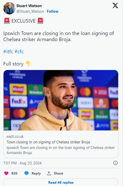 Gazetari anglez, Stuart Uatson, i cili është shumë pranë klubit të Ipsuiç, raporton se palët duket se kanë gjetur gjuhën e përbashkët për sa i përket huazimit të sulmuesit shqiptar drejt klubit të sapo ngjitur në Premier Ligë.