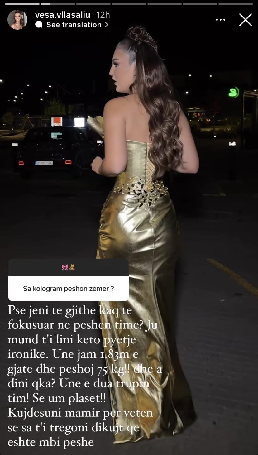 E pyeten “Sa kilogram peshon zemër”, kështu reagoi Vesa, “Pse jeni të gjithë kaq të fokusuar në peshën tim? Ju mund t’i lini këto pyetje ironike. Unë jam 1.83me gjatë dhe peshoj 75kg!! Dhe a din çka? Unë e dua trupin tim! Se um plaset! Kujdesuni me mirë për vetën se sa t’i tregoni dikujt qe është mbi peshë”.