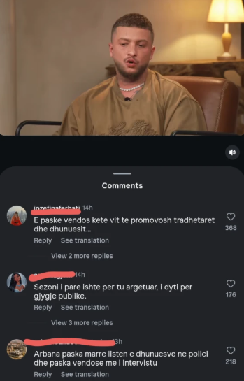 Komentet në rrjet ishin të shumta dhe të ashpra. Disa prej tyre ishin: “Tmerr, dhunuesit i jepet hapësirë publike,” “E paske vendos këtë vit të promovosh tradhtarët dhe dhunuesit,” dhe “Arbana paska marrë listën e dhunuesve në polici dhe paska vendose me i intervistu.”