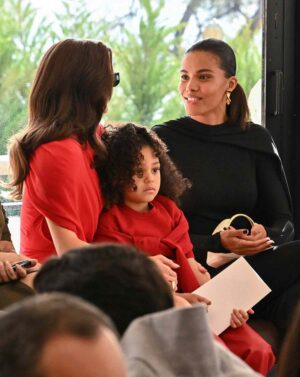 Jenner-it iu bashkua e bija Stormi, e cila u ul në prehrin e saj, ndërsa kishte veshur një fustan të kuq me triko të kuqe të lidhur rreth shpatullave.