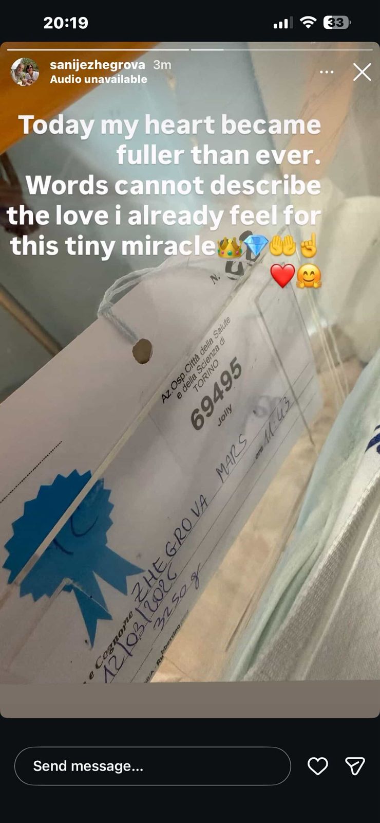Përmes një postimi emocionues në llogarinë e saj në Instagram, Sanija ndau një foto direkt nga inkubatori i spitalit “Città della Salute e della Scienza” në Torino, qyteti ku e gjithë familja është zhvendosur për të jetuar pranë Edonit që pas transferimit të tij të bujshëm tek bardhezinjtë vjeshtën e kaluar. “Sot zemra ime u mbush më shumë se kurrë. Fjalët nuk mund ta përshkruajnë dashurinë që tashmë ndiej për këtë mrekulli të vogël,” shkroi ajo sipër imazhit ku duket qartë kartela e bebes.
