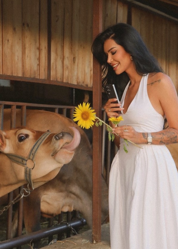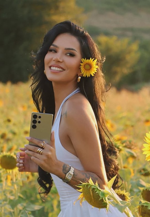 Në imazhet e publikuara, ajo shihet e veshur me një fustan të bardhë të gjatë, ndërsa pozon në një fushë të mbushur me lulediellë, duke dhënë ndjesinë e një skene të marrë nga një film.