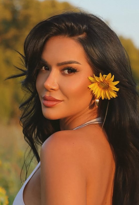 Flokët e gjatë të lëshuar dhe detaji i lulediellit pas veshit e bëjnë paraqitjen edhe më të veçantë, duke i shtuar një prekje natyrale gjithë setit fotografik.