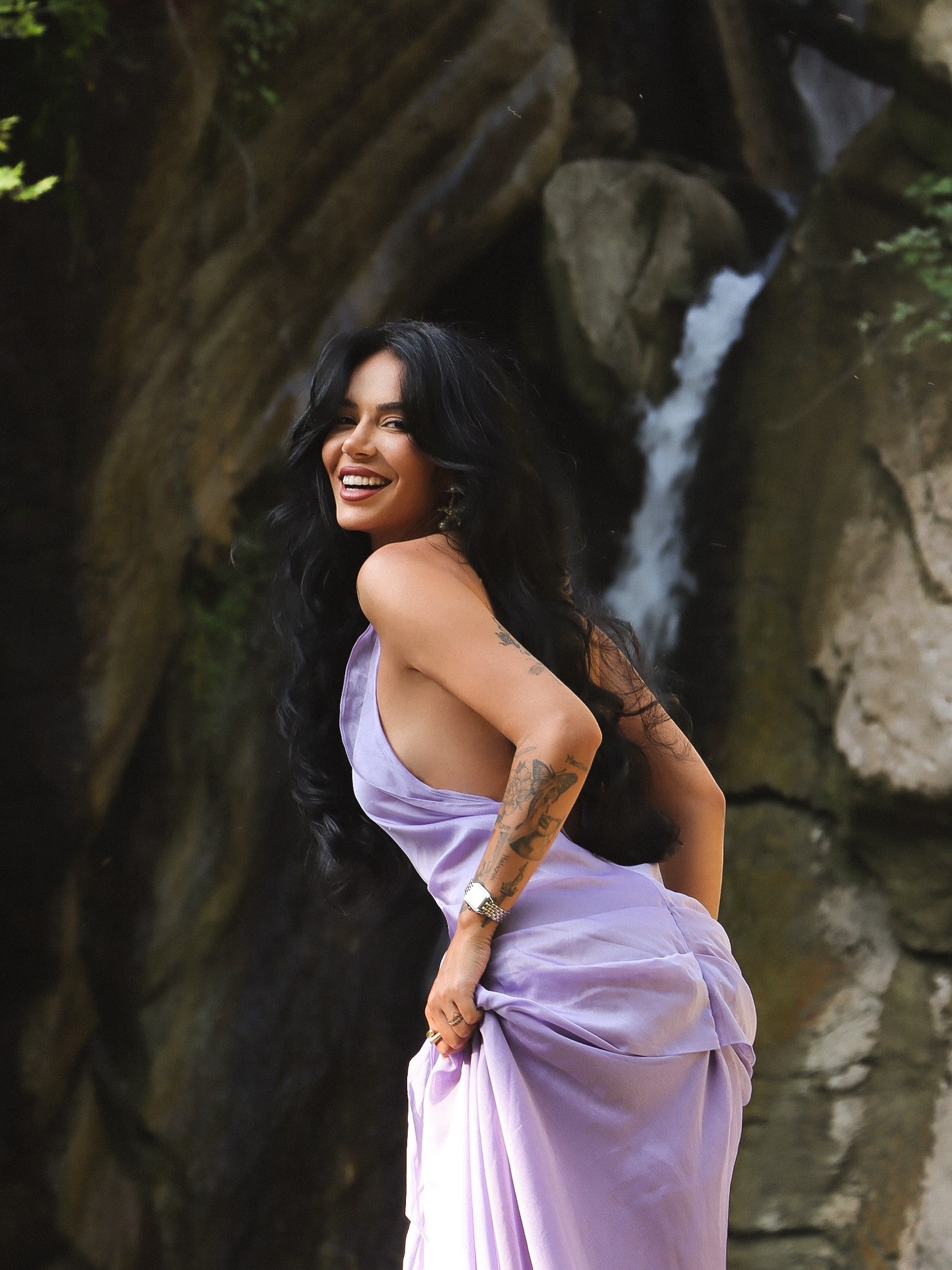 E ulur pranë një ujivare, e veshur me një fustan lejla me shpatulla zbuluar, ajo ka pozuar si një sirenë.