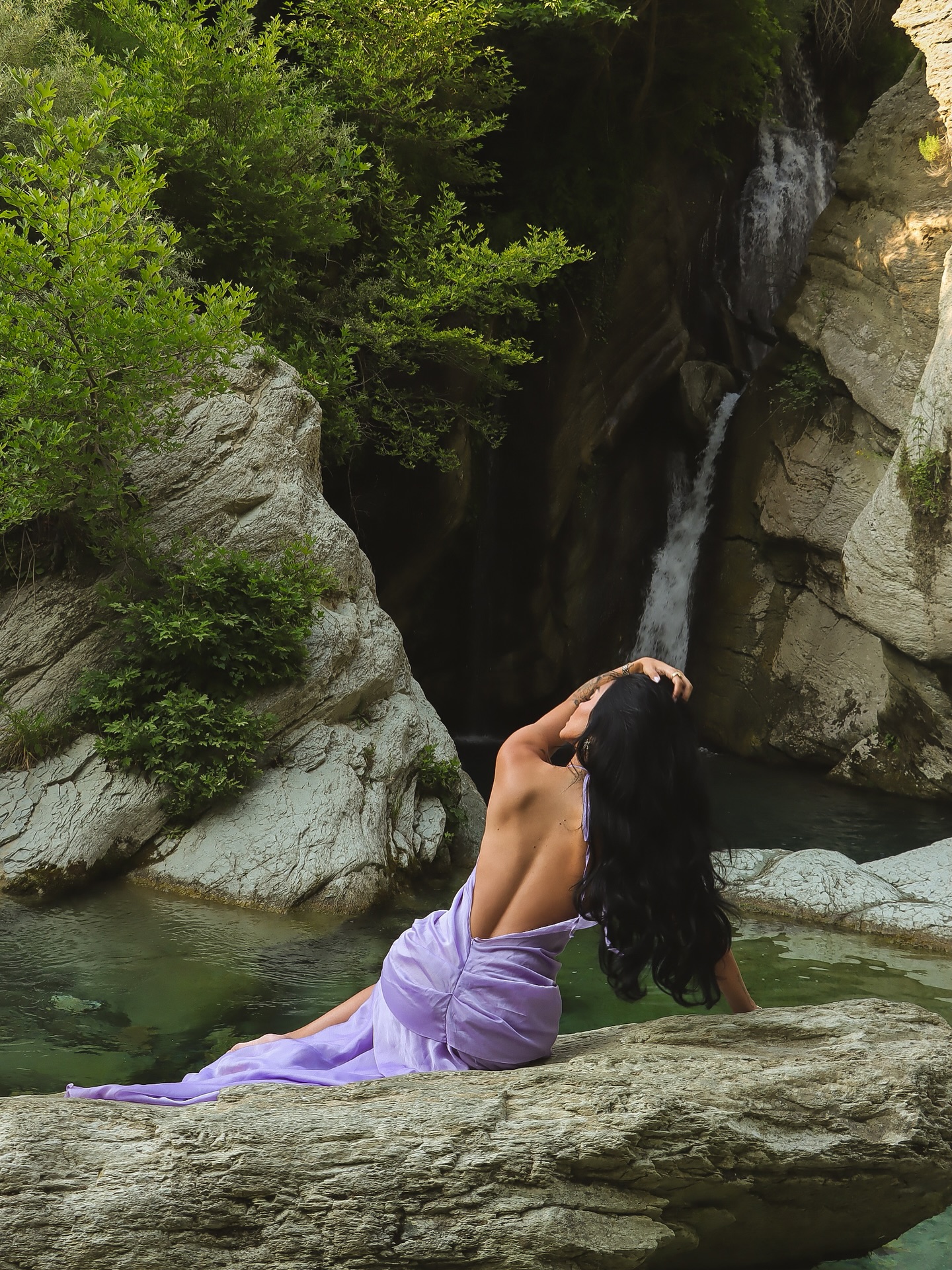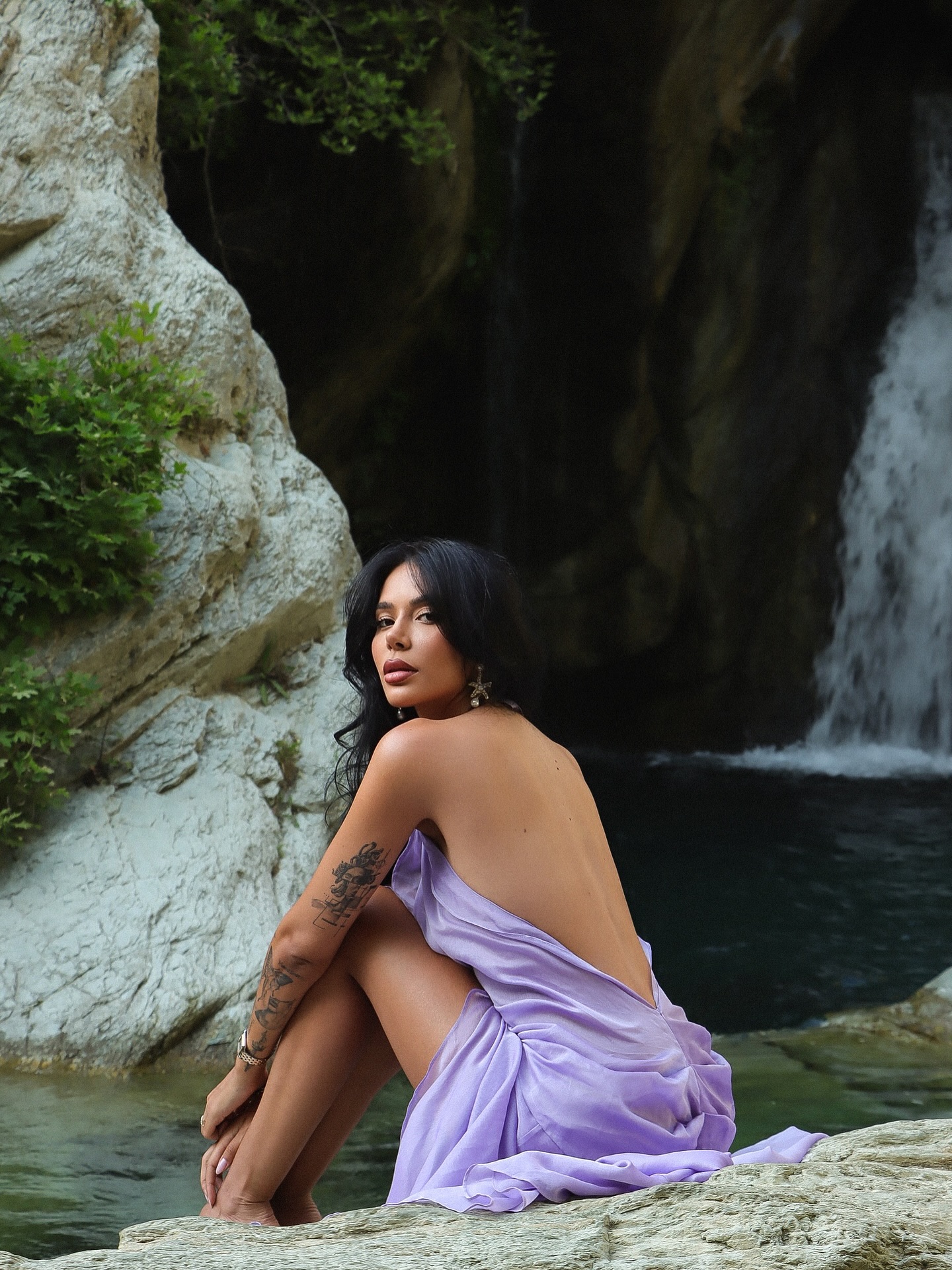 E ulur pranë një ujivare, e veshur me një fustan lejla me shpatulla zbuluar, ajo ka pozuar si një sirenë.
