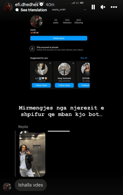 “Mirëmëngjes nga njerëzit e shpifur që mban kjo botë”, i është përgjigjur publikisht Efi personit që ka shkruar këtë mesazh.