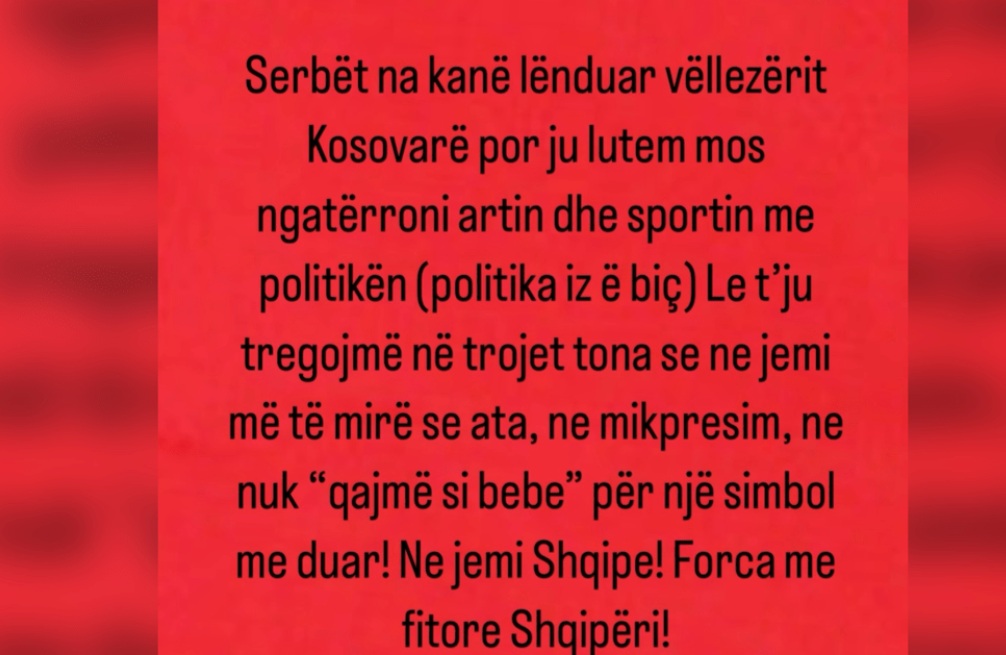 “Serbët na kanë lënduar vëllezërit Kosovarë por ju lutem mos ngatërroni artin dhe sportin me politikën (politika iz ë biç) Le t’ju tregojmë në trojet tona se ne jemi më të mirë se ata, ne mikpresim, ne nuk “qajmë si bebe” për një simbol me duar! Ne jemi Shqipe! Forca me fitore Shqipëri!”, shkroi ajo.