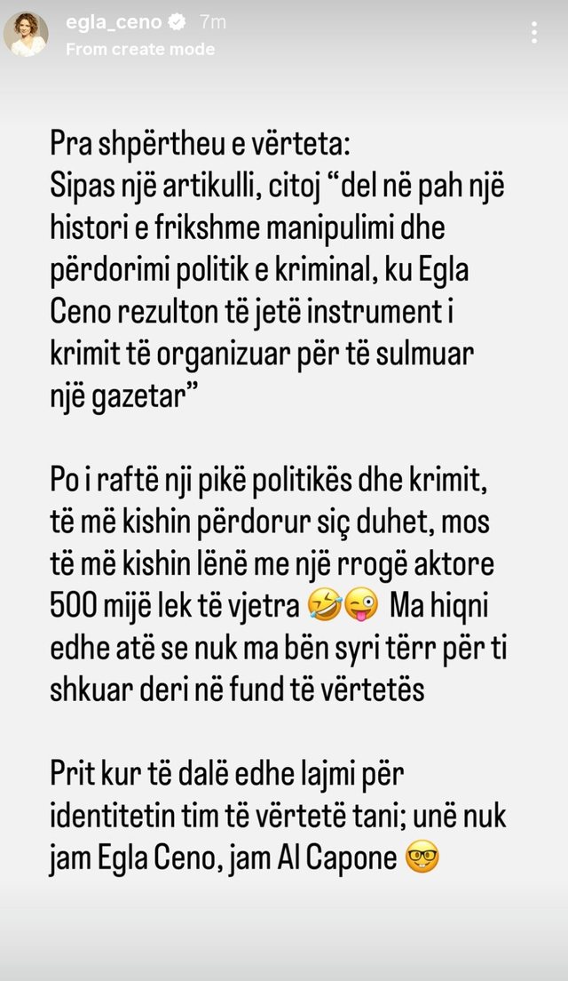 Ajo shton se nuk do të ndalet “deri në fund të së vërtetës”, ndërsa me humor e përmbyll reagimin me fjalinë: “Unë nuk jam Egla Ceno, jam Al Capone”.