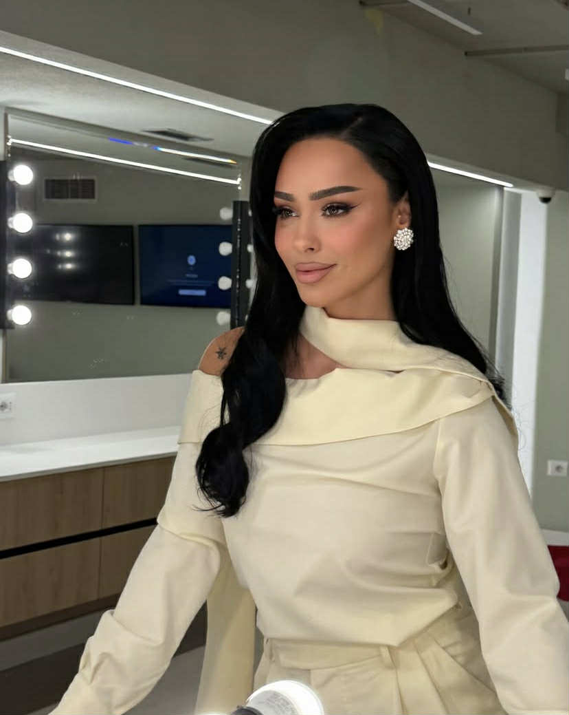 E veshur me një bluzë ngjyrë ari që i thekson elegancën, Egli duket në super formë dhe më rrezatuese se kurrë më parë.