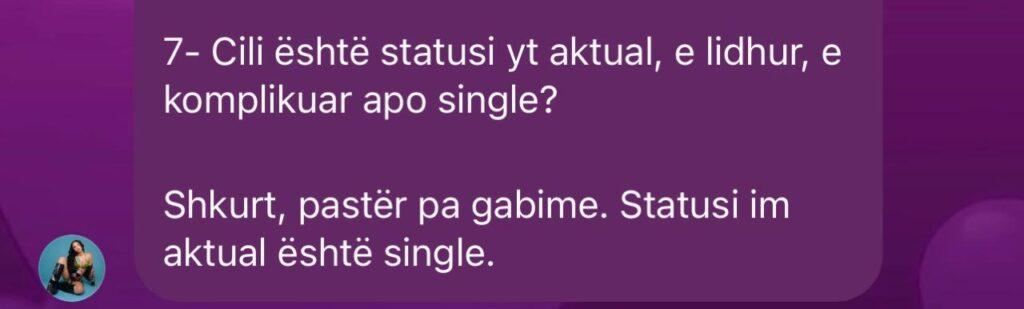 Ndër dhjetëra pyetje të fansave, njëra prej tyre ngjalli veçanërisht interes: “Cili është statusi yt aktual, e lidhur, e komplikuar apo single?”