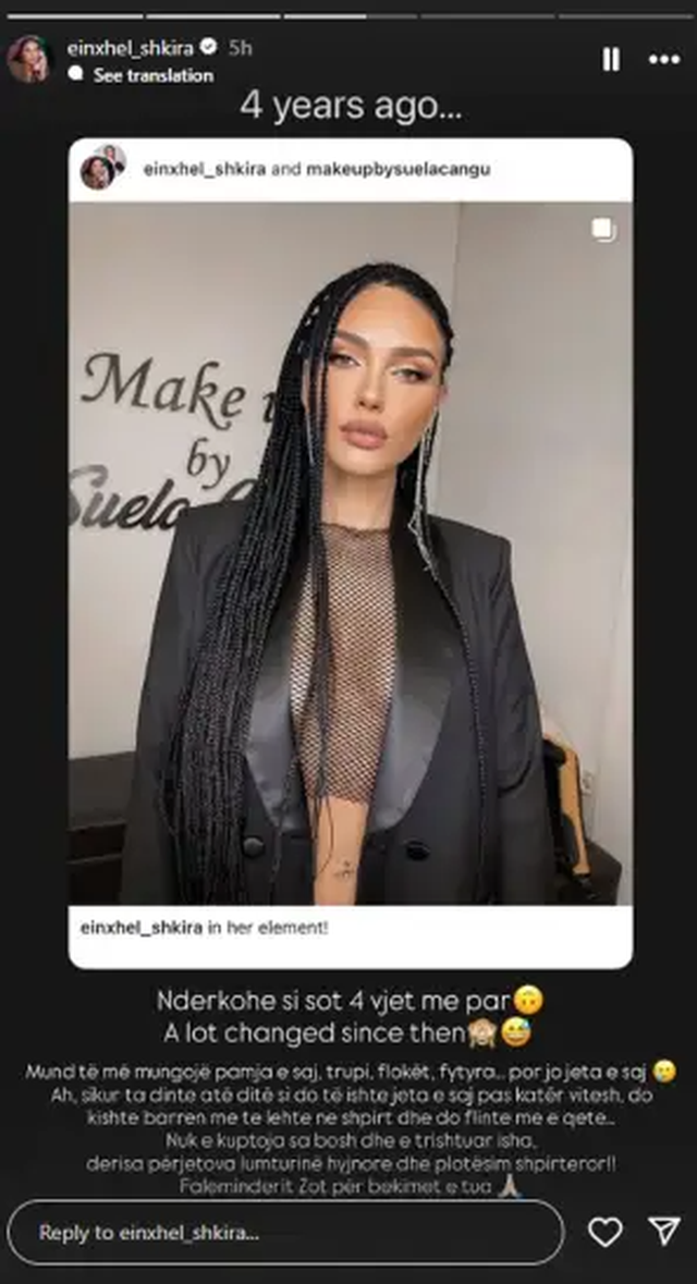 Në një postim nostalgjik në InstaStory, Einxhel ndau një kujtim nga ajo periudhë, duke reflektuar mbi rrugëtimin e saj personal dhe ndryshimet që ka përjetuar ndër vite. “Ndërkohë si sot, 4 vjet më parë. Kanë ndryshuar shumë gjëra që atëherë”, shkroi ajo, duke iu referuar një fotografie nga ajo kohë.