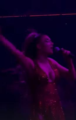 Këngëtarja e njohur është shfaqur në një mbrëmje muzikore me një fustan të kuq vezullues, i cili binte në sy për xixat që e mbulonin tërësisht.