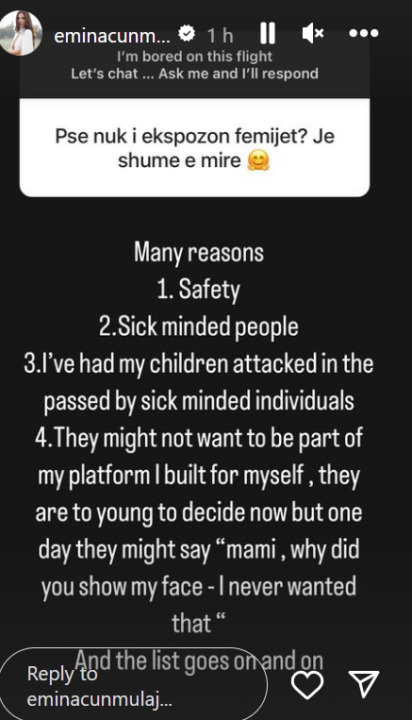 Modelja e njohur ka bërë një komunikim virtual me ndjeksit e saj në Instagram, të cilët i kanë drejtuar pyetje të shumta. Një ndër pyetjet që i është bërë modeles ka lidhje me ekspozimin e fëmijëve në rrjetet sociale.