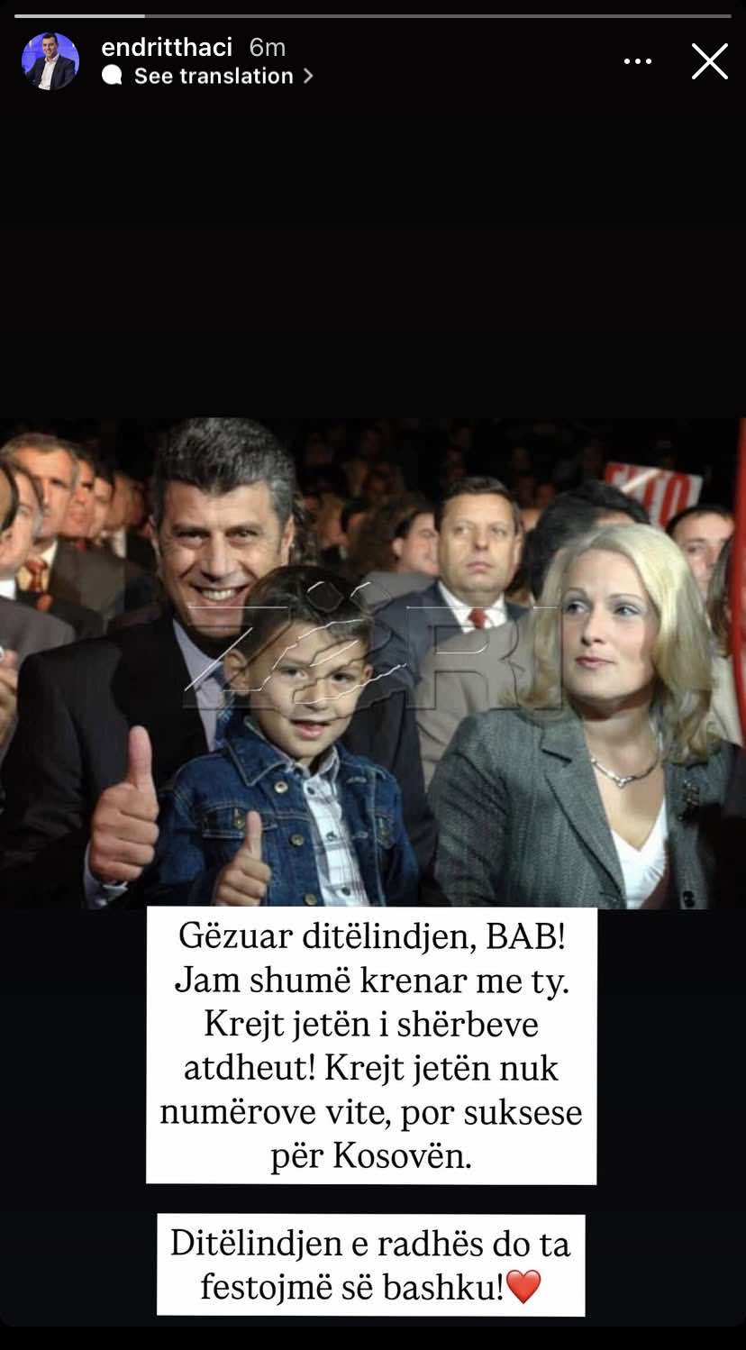 “Gëzuar ditëlindjen, BAB! Jam shumë krenar me ty. Krejt jetën i shërbeve atdheut!” – shkruan ai në një storie në Instagram, duke e vlerësuar kontributin e të atit në ndërtimin dhe zhvillimin e Kosovës.
