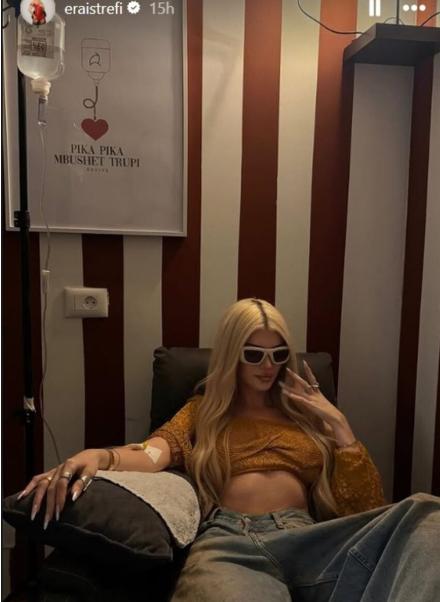 Në një foto të publikuar në Instagram, Era shihet duke marrë infuzion, por pa dhënë asnjë detaj të mëtejshëm mbi arsyet e kësaj gjendjeje.