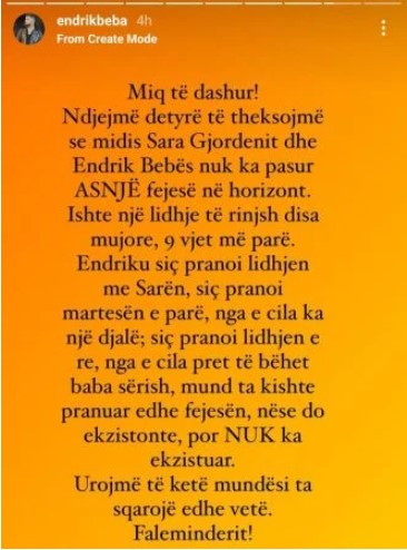 “Ndiejmë detyrën të theksojmë se midis Sara Gjordenit dhe Endrik Bebës nuk ka pasur ASNJË fejesë në horizont. Ishte një lidhje të rinjsh disa mujore, 9 vite më parë. Endriku, siç pranoi lidhjen me Sarën, siç pranoi martesën e parë nga e cila ka një djalë, siç pranoi lidhjen e re nga e cila pret të bëhet baba sërish, mund të kishte pranuar edhe fejesën, nëse do të ekzistonte, por NUK ka ekzistuar. Urojmë të ketë mundësi ta sqarojë edhe vetë. Faleminderit”, shkruhet në postim.