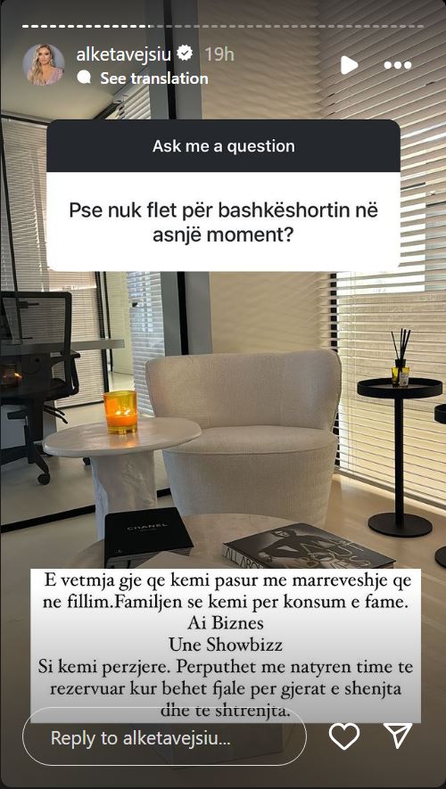 “E vetmja gjë që kemi pasur me marrëveshje që në fillim. Familjen nuk e kemi për konsum dhe famë. Ai biznes, unë showbizz, nuk i kemi përzjerë. Përputhet me natyrën time të rezervuar kur bëhet fjalë për gjërat e shtrenjta dhe të shenjta,” është përgjigjur Alketa.