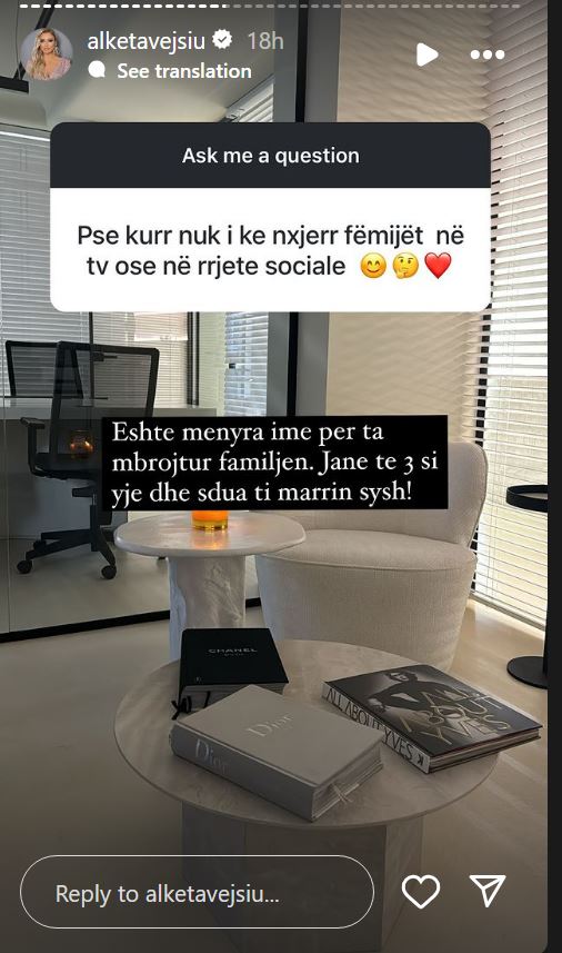 Teksa është pyetur nga një fans i tretë se “përse nuk i nxjerr fëmijët në rrjete sociale apo tv?”, Alketa është përgjigjur se kjo është mënyra e saj për ta mbrojtur familjen.