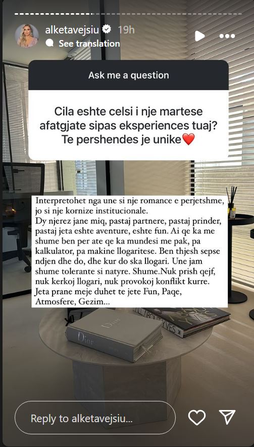 “Interpretohet nga unë si një romancë e përjetshme, jo si një kornizë institucionale. Dy njerëz janë miq, pastaj partnerë, pastaj prindër, pastaj jeta është aventurë, është qejf. Ai që ka më shumë bën për atë që ka mundësi më pak, pa kalkulator pa makinë llogaritëse. Bën thjeshtë se ndjen dhe do, dhe kur do ska llogari. Une jam tolerante si natyrë. Nuk prish qejf. Nuk provokoj konflikt. Jeta pranë meje duhet të jetë qejf, paqe, atmosferë,gëzim,” ka shkruar moderatorja.