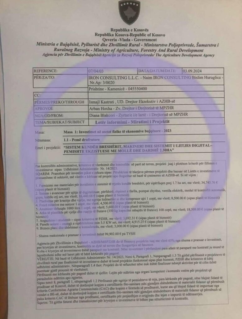 Përmes dokumenteve të siguruara nga Periskopi, del që kompania “Iron Consulting”, me pronar këshilltarin e jashtëm të Pecit, Naim Huruglica, ka fituar grant nga AZHB për projektin 100 mijë eurosh.