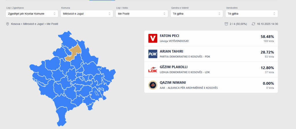 Nga 50% e votave të numëruara të diasporës, kandidati i Vetëvendosjes për kryetar të Mitrovicës po fiton bindshëm me 58.48%, duke e lënë pas Arian Tahirin e PDK-së me 28.72%.